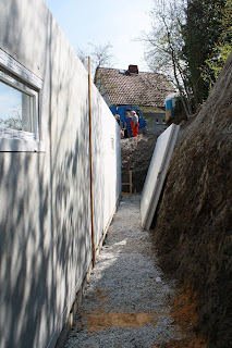 Ich denke, dass ich bis Freitag mit der Unterstützung von Mathi, mit dieser Arbeit fertig bin denn am Wochenende bekommen wir Unterstützung von meinen Eltern, Mathi, Heiko (kommt extra aus der Schweiz), Carsten und Christoph um die Kaltschweißbahnen zu kleben. Die werden dann über die feste Dickbeschichtung bis Unterkante Bodenplatte geklebt. Dann hoffe ich, dass der Keller dicht ist.
